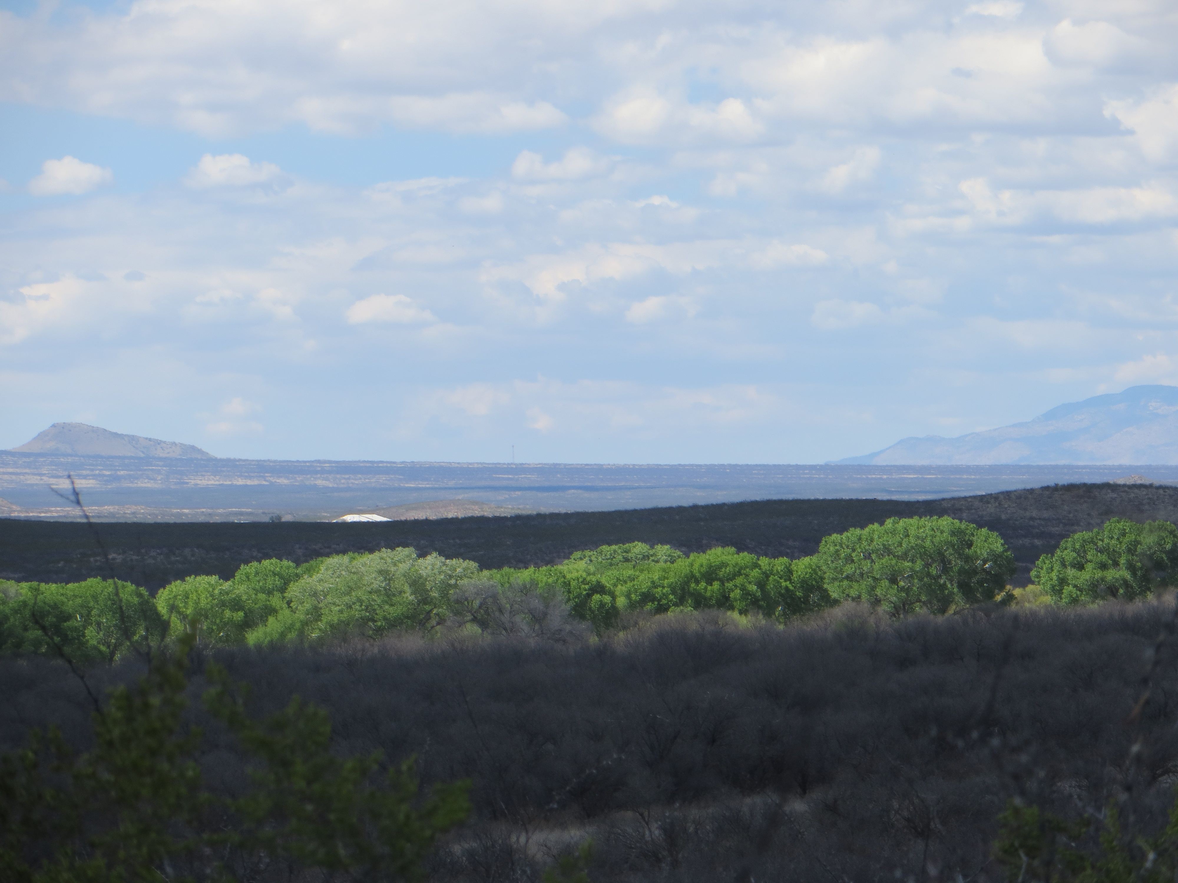 The view from the Fairbank Cemetery. The San Pedro River can be found if you follow the green ribbon of cottonwood trees. This riparian area serves as a superhighway for migratory birds and even boasts a population of beavers.