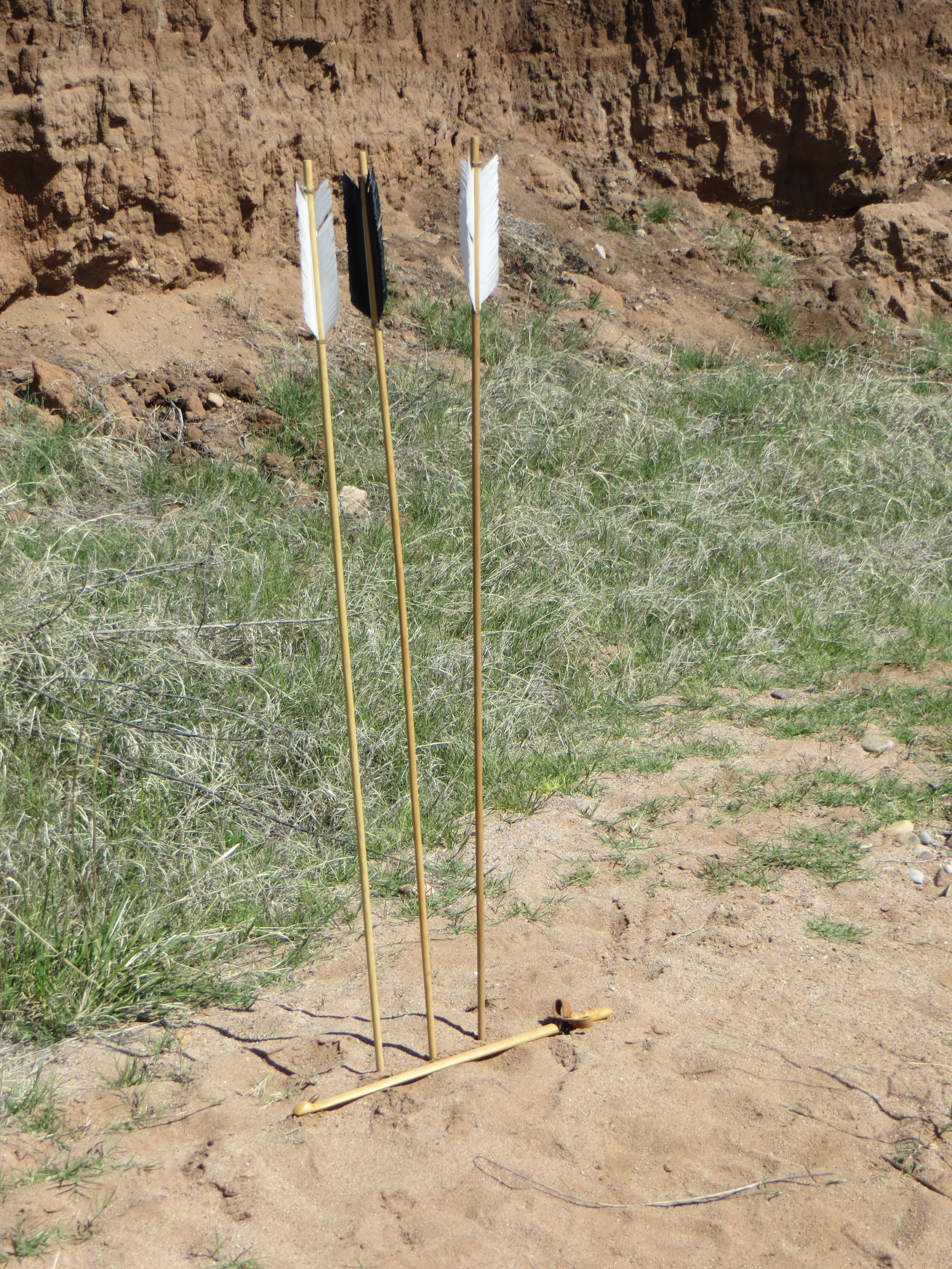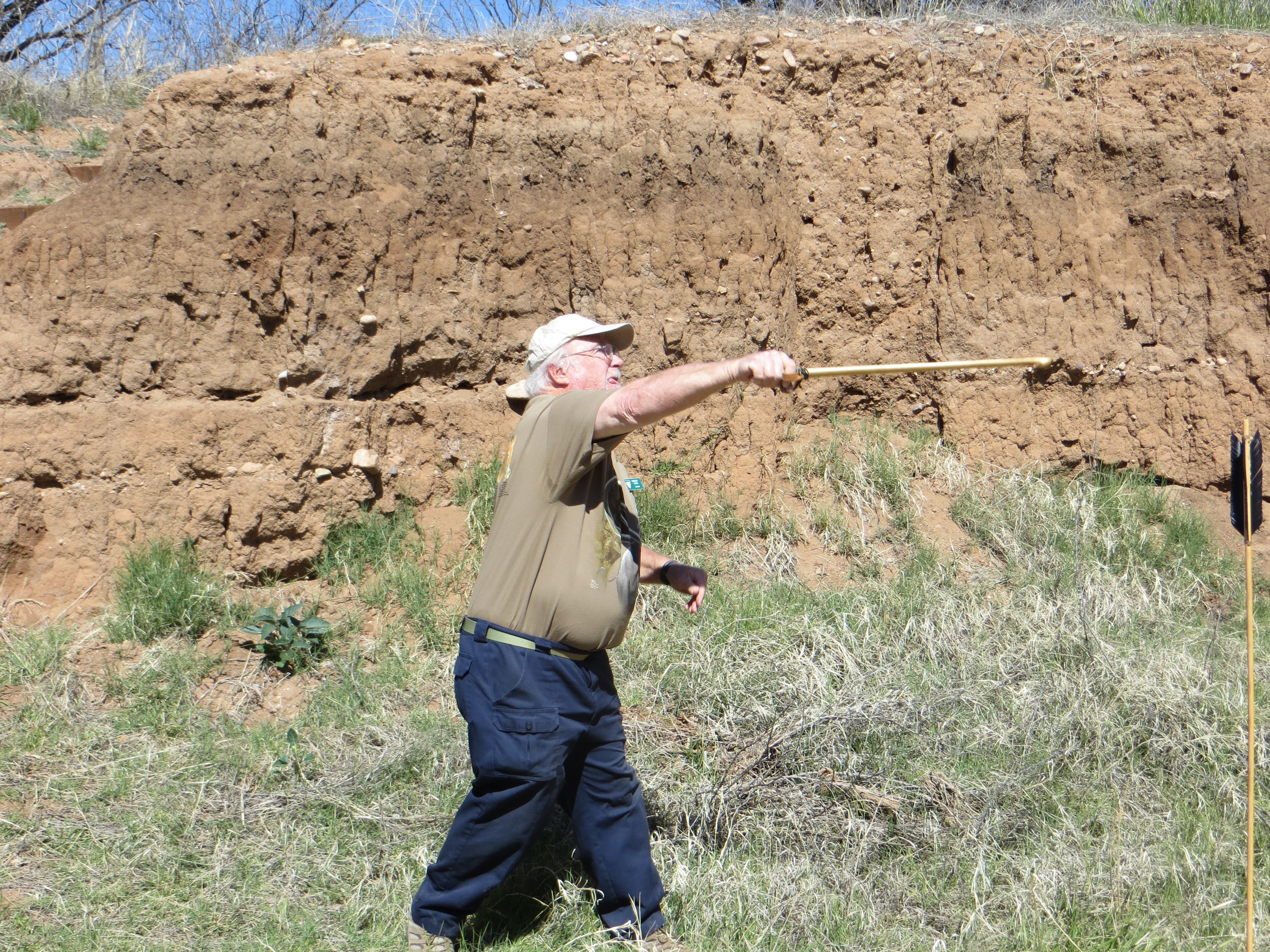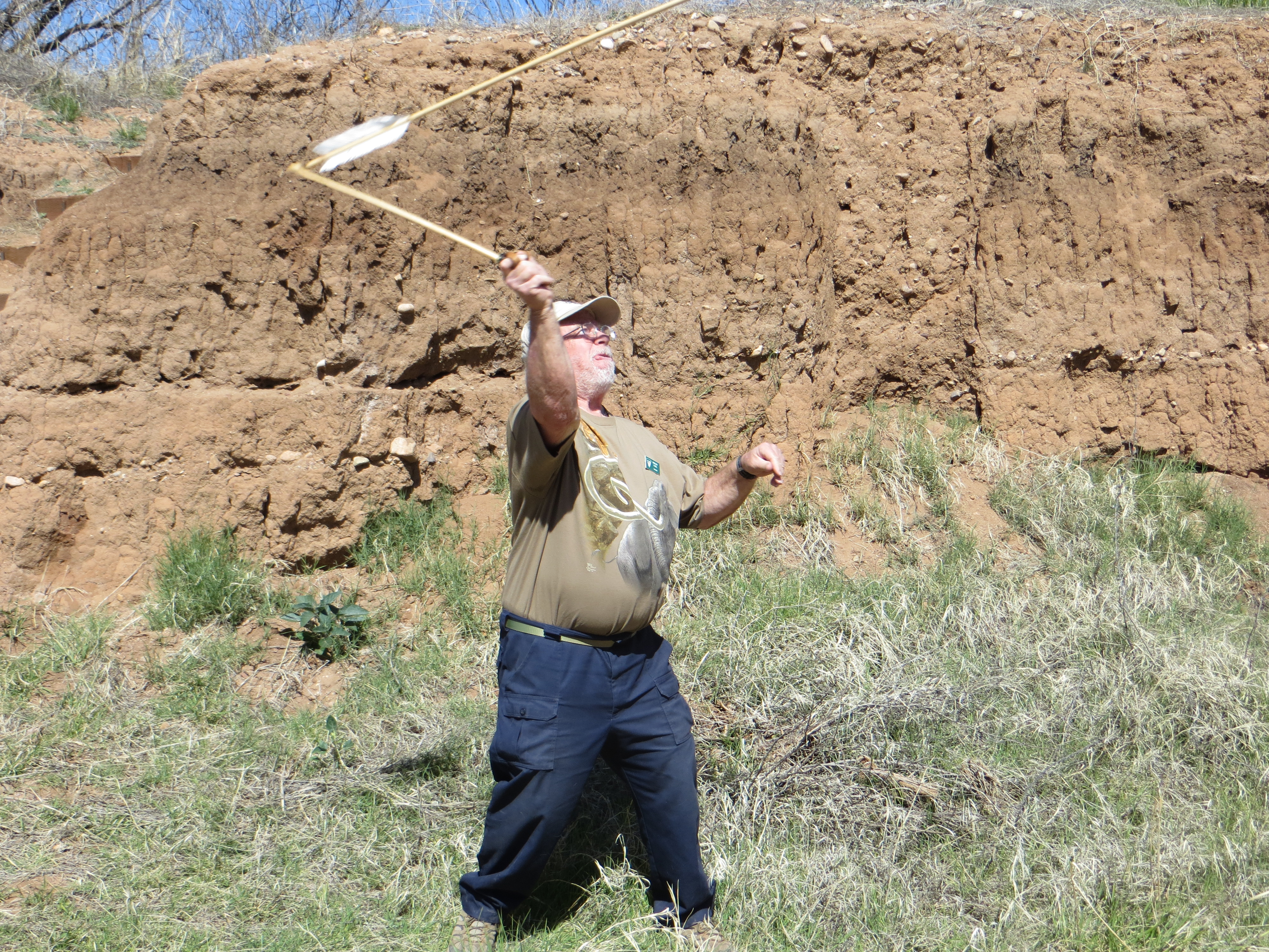 After I get the facts, things begin to get very interesting. Dwight picks up what appears to be a stick with the ends wrapped in rawhide. It’s an atlatl he explains. The stick has a small knob sticking of it. The shaft of the arrows have an indentation at the end of them. Hunters would fit it onto the knob of the atlatl and hurl the arrow at prey. The atlatl puts more force into the arrow and allows it to go a further distance. Then Dwight makes things even more interesting by picking up an atlatl, notching an arrow on to it and letting it fly down the stream bed. Even today, this ice age tool is pretty impressive.
