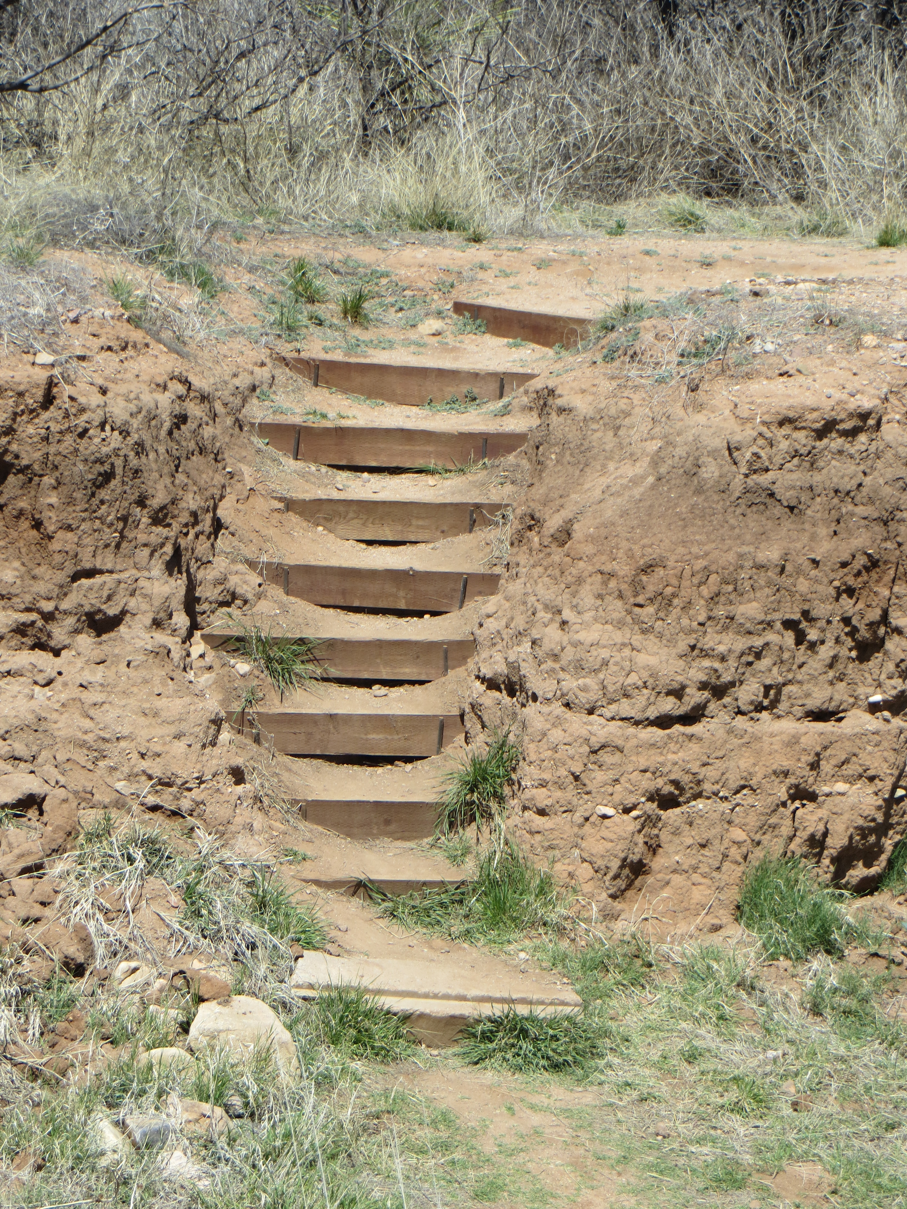 I pull in to the large parking lot, grab some water and hit the trail. It’s a easy walk with lots of signs to direct me to the interpretive loop. The loop crosses a stream bank. The steps that lead down to it and back up again are mildly challenging. In the stream bank, I notice three arrows sticking in the ground.